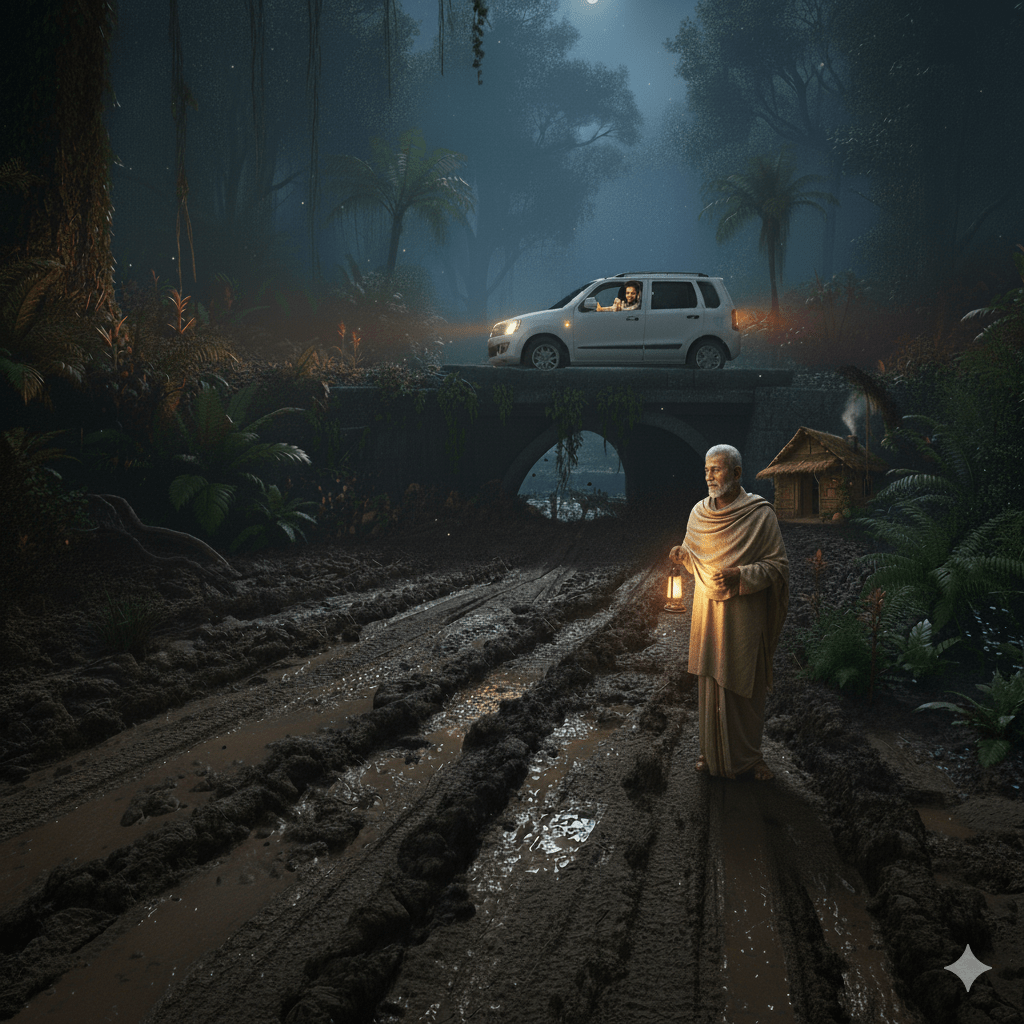 मैं “ना-ना” करती रही — पर विवेक ने उस पुल पर गाड़ी चढ़ा दी। और फिर धम की आवाज़ से गाड़ी पुल की दूसरी तरफ़ उतर गई। थोड़ी देर के लिए राहत महसूस हुई — कि चलो, हम पुल पार कर लिए। लेकिन नहीं… अभी लगभग 5 मीटर ही आगे बढ़े थे कि सामने कीचड़ आ गया! अब लो, काटो तो खून नहीं। ऐसी स्थिति में हम फँस गए — आगे जा नहीं सकते,